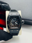 Black wristwatch with intricate design held by a gloved hand on a white surface.