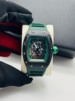 Green wristwatch with a black strap on a white surface, with a black box in the background.